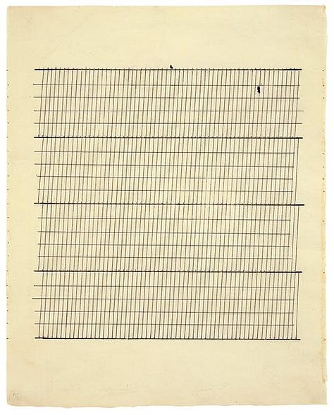 I think it's also useful to know that the painter, Agnes Martin, struggled with her mental health. Her decision to leave New York and live alone in the desert to be able to focus only on painting was at least in part to keep her schizophrenia under control. She literally turned away from the world. Beyond that, I’m not sure how much you need to know about Martin in order to read Chang's book meaningfully. I see the connections between certain specific paintings and Chang's responses – some of them are obvious. Chang often describes the painting in her poem, for example, counts the number of grid squares, references the thickness of the pencil lines, etc. But it’s a one-way street. In looking up the background to the painter, I learned a lot about Agnes Martin (I found her work powerful, and the details of her life absorbing) but that didn't illuminate the poetry particularly. And the content of the poems (mainly about Chang) didn't help me understand Martin's paintings. So in that sense the book doesn't really strike me as a "conversation" between them.